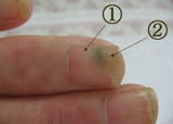 数年前に農業用機械で、左手第3〜5指の爪根を傷つけてしまったそうです。それ以来、仕事でたくさん指を使う春になると、爪が爪床からはがれてしまう状態(写真参照:Aの部分)に、毎年なっていたそうです。ところが、「不思議な事に、今年ははがれていない。(写真参照:@の部分)」ということに、最近気づかれたそうです。施術によってこうなったのか?それとも他に何かあったのか?施術により爪が引っ付いてきたのであれば、”傷ついた爪根当たりに、栄養・酸素etcがいきわたるようになり、正常な状態に戻ってきた”と推測されます。